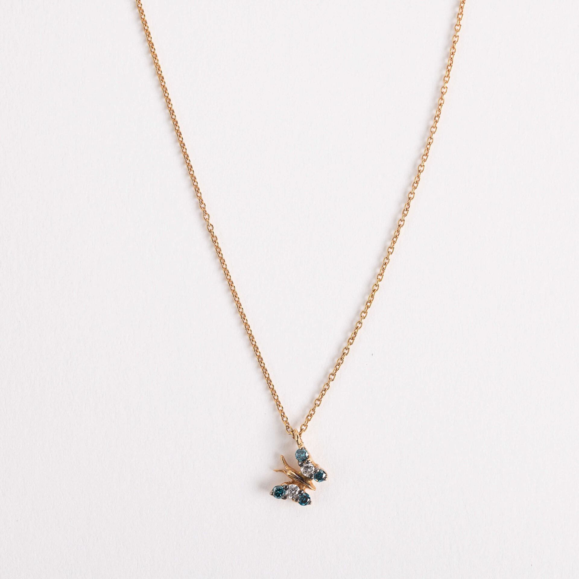 Details: Crafted in 18kt rose gold, this petite butterfly pendant features four blue diamonds totalling 0.06ct and two white brilliant-cut diamonds totalling 0.04ct. The butterfly measures 6 mm in height and 6 mm in length (excluding the hoop). It is fully integrated into an 18kt rose gold chain with a total length of 42 cm, and may also be worn at 39 cmusing the second adjustable hoop for a shorter, more tailored fit.