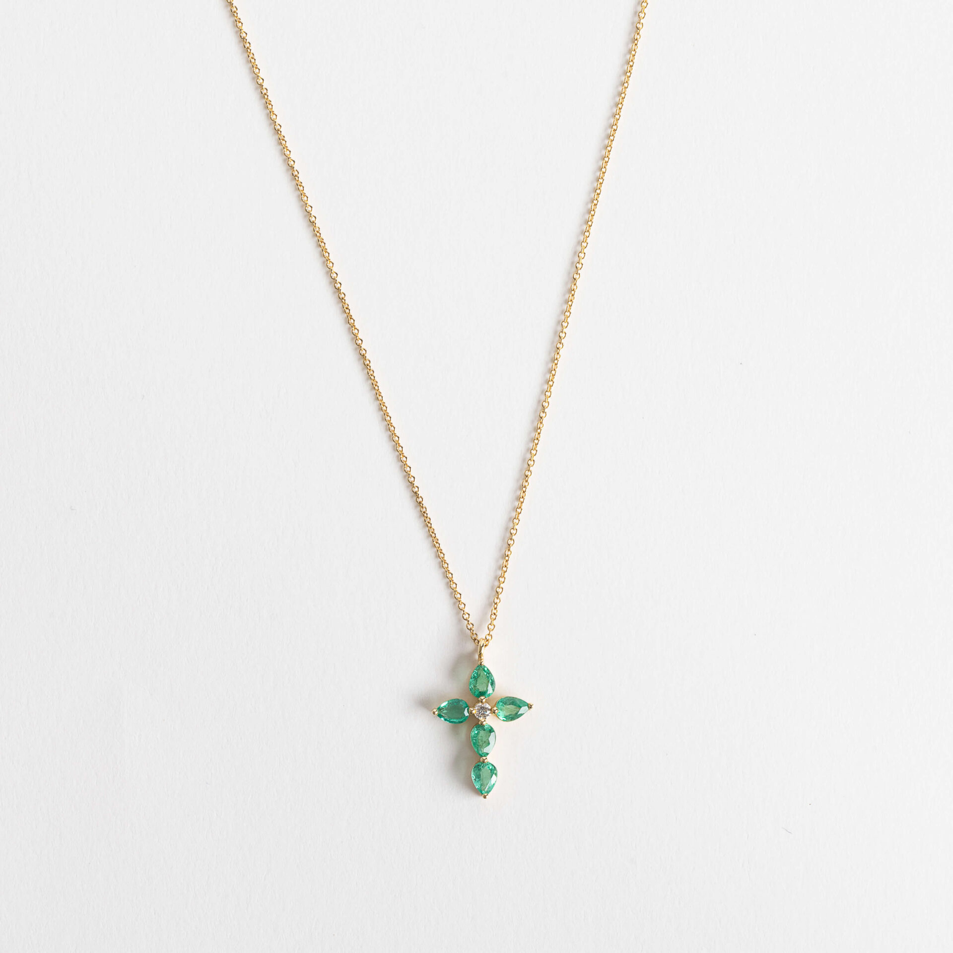Description: Refined, feminine, and full of vibrant colour, Dione is a captivating emerald cross that beautifully balances delicacy with presence. Though slightly smaller in size, it loses nothing in significance. Five luminous pear-cut emeralds form a graceful, organic silhouette, each stone arranged like a petal around a single brilliant diamond at the centre. The combination gives Dione a radiant, jewel-like quality — elegant, eye-catching, and irresistibly feminine.