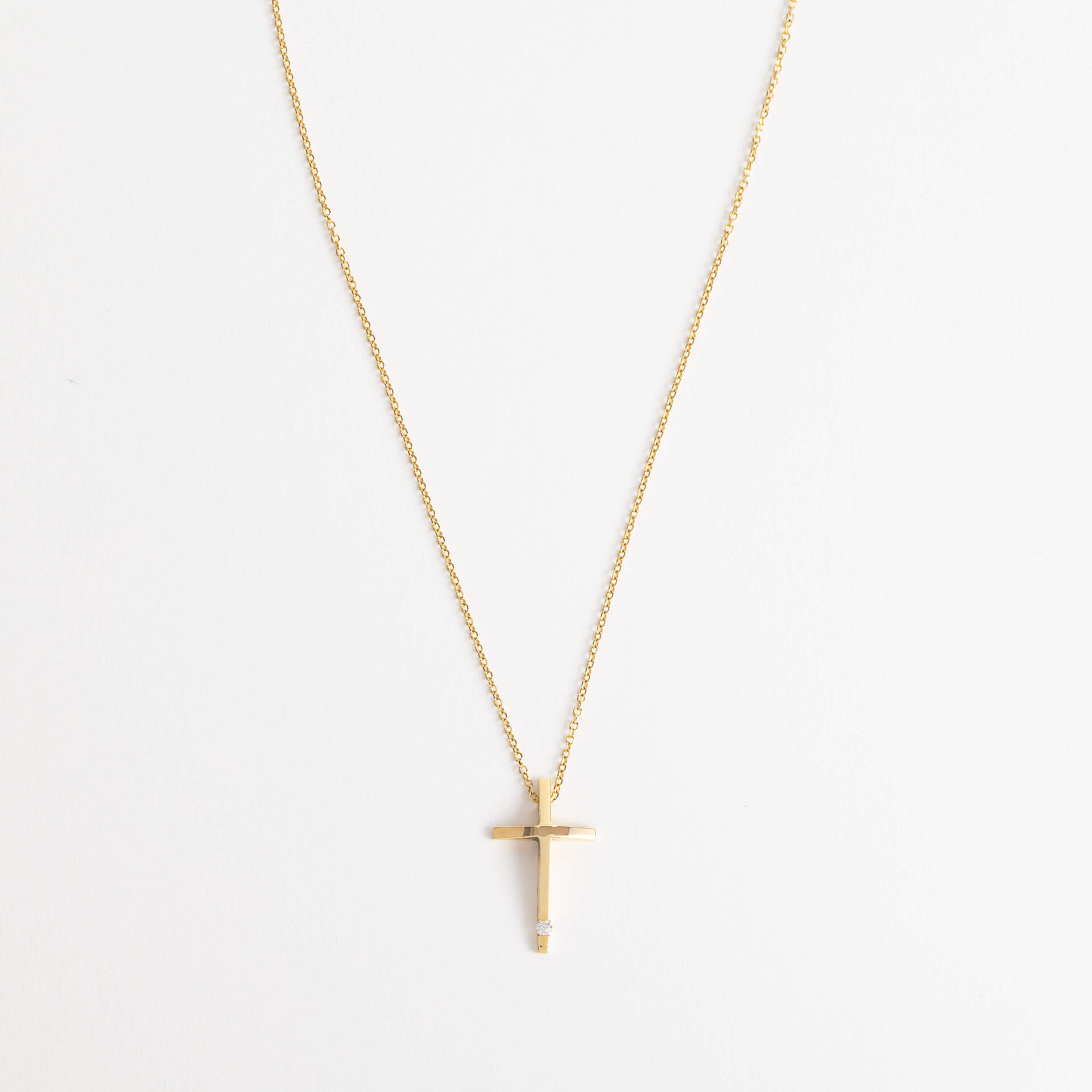 Description: Delicate and beautifully refined, Erofili is a modern 18kt yellow gold cross designed with soft curves and a clean, sculptural silhouette. Although slightly smaller in scale, it carries an elegant presence, enhanced by a single 0.04ct diamond placed thoughtfully near the base of the vertical arm — a subtle detail that elevates the design without overwhelming it.