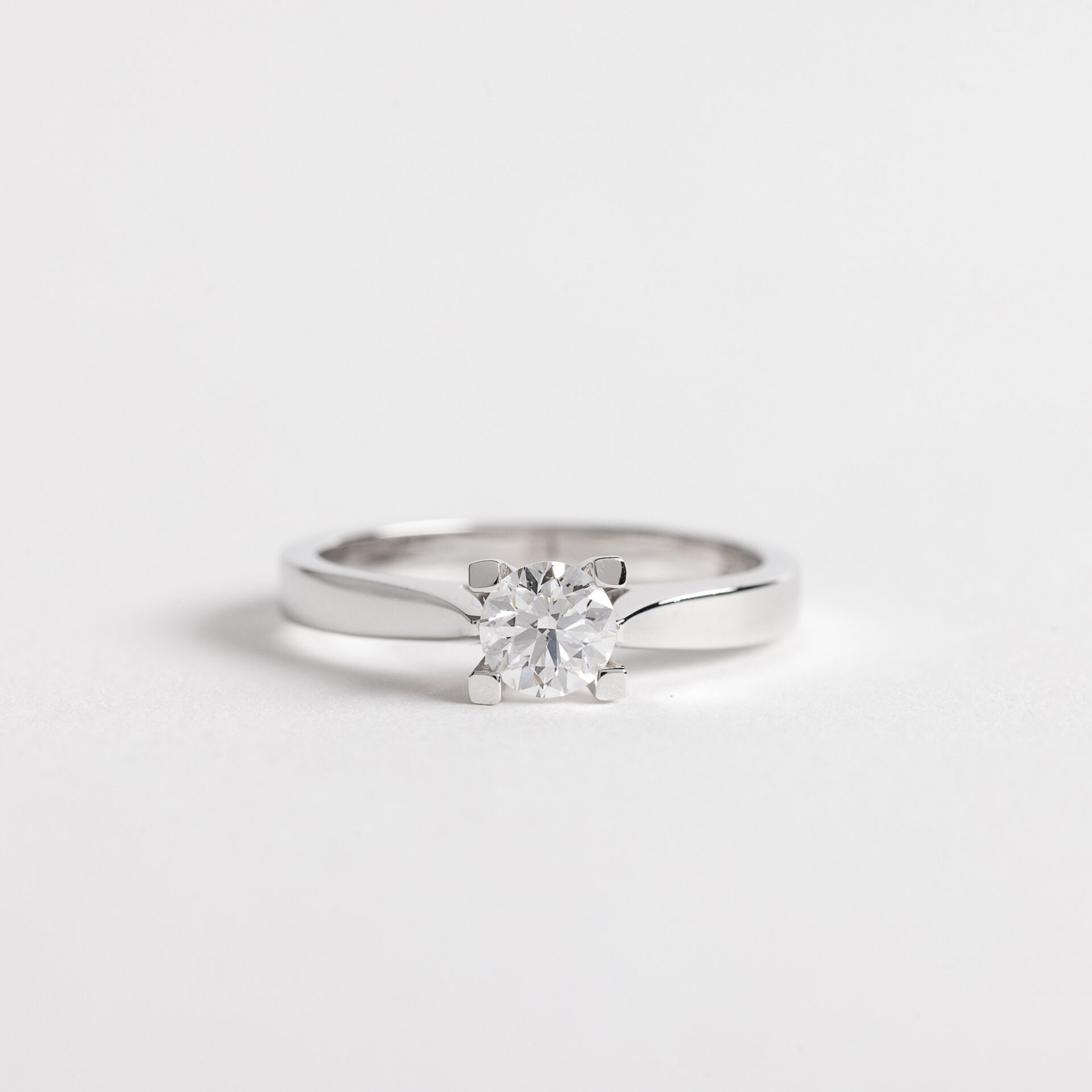At the heart of the design rests a 0.50ct round brilliant diamond of exceptional E colour, held in a clean four-prong setting that elevates its sparkle with effortless clarity. Crafted in 18K white gold, the Grace Ring relies entirely on the beauty and quality of its natural diamond, without any lab-grown stones or decorative additions. For those seeking a traditional solitaire with meaningful presence, Grace is a flawless choice.