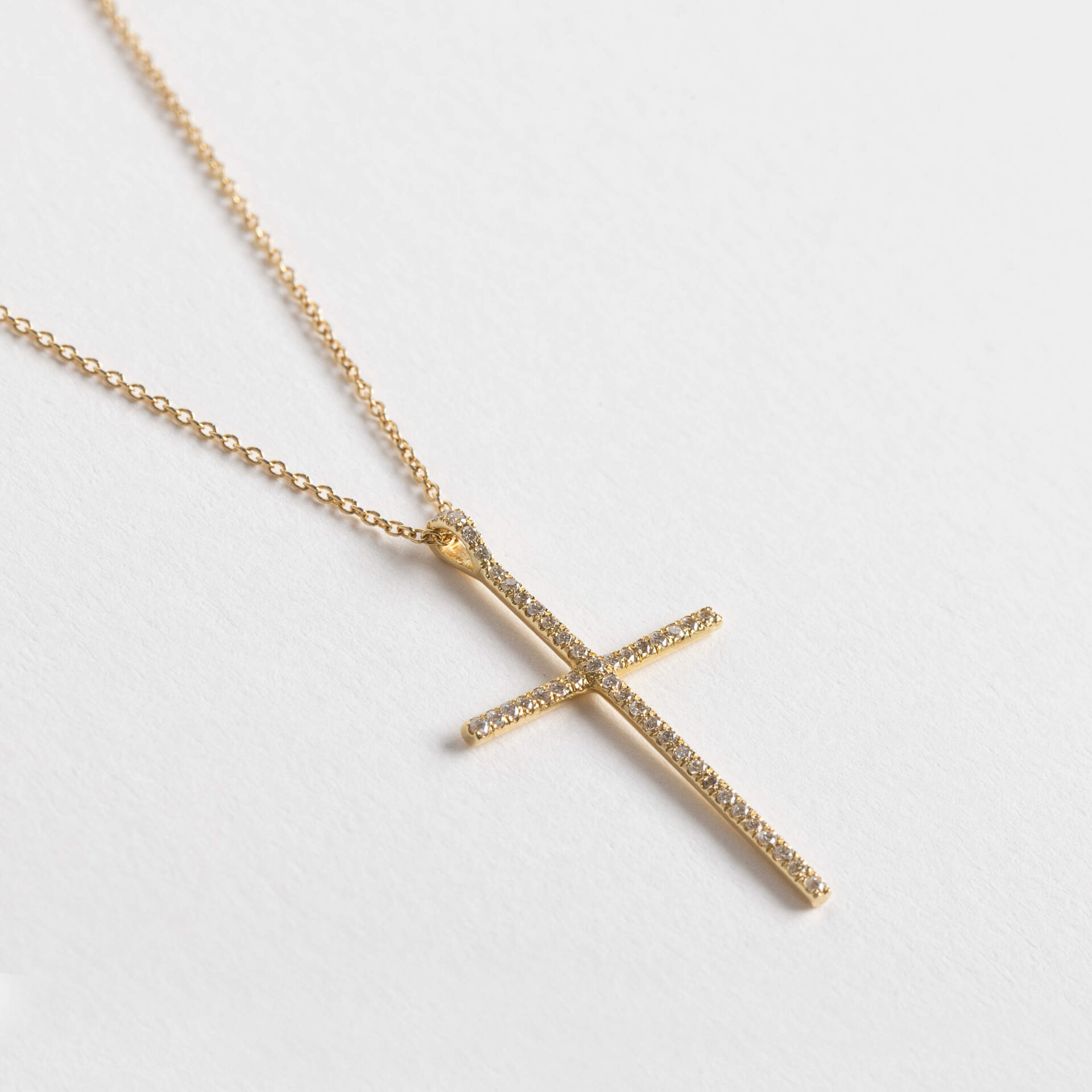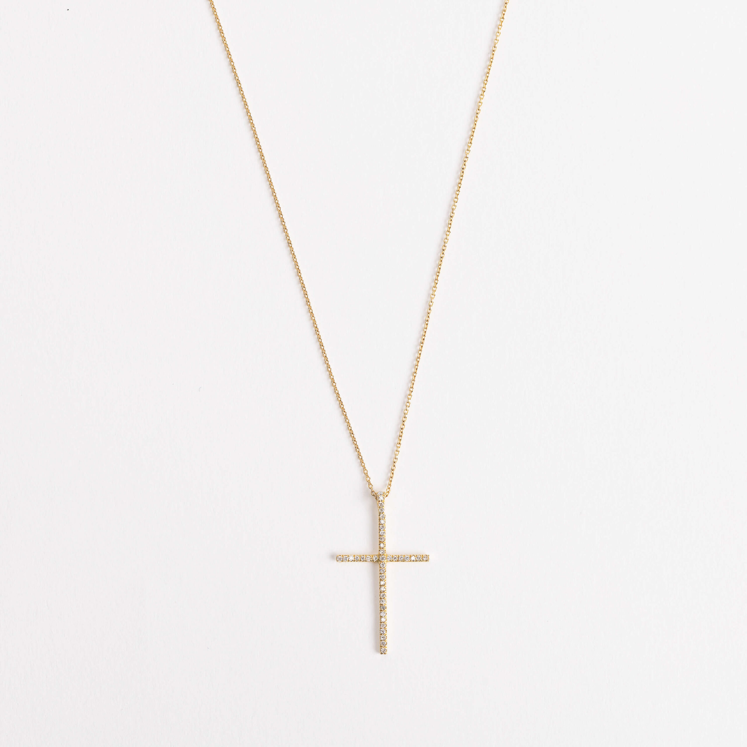 Description: Fine, delicate, and beautifully refined, Irene is a modern interpretation of the classic diamond cross — slim, lightweight, and elegantly understated, yet crafted entirely in high-quality materials. What makes this piece truly special is the seamless line of diamonds that continues all the way up to the hoop, creating a soft, uninterrupted sparkle that flows naturally along the curve. The result is a graceful, feminine design that feels both contemporary and timeless.