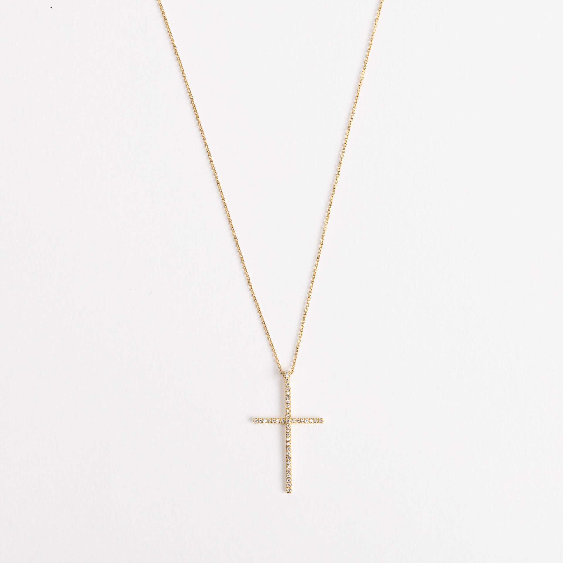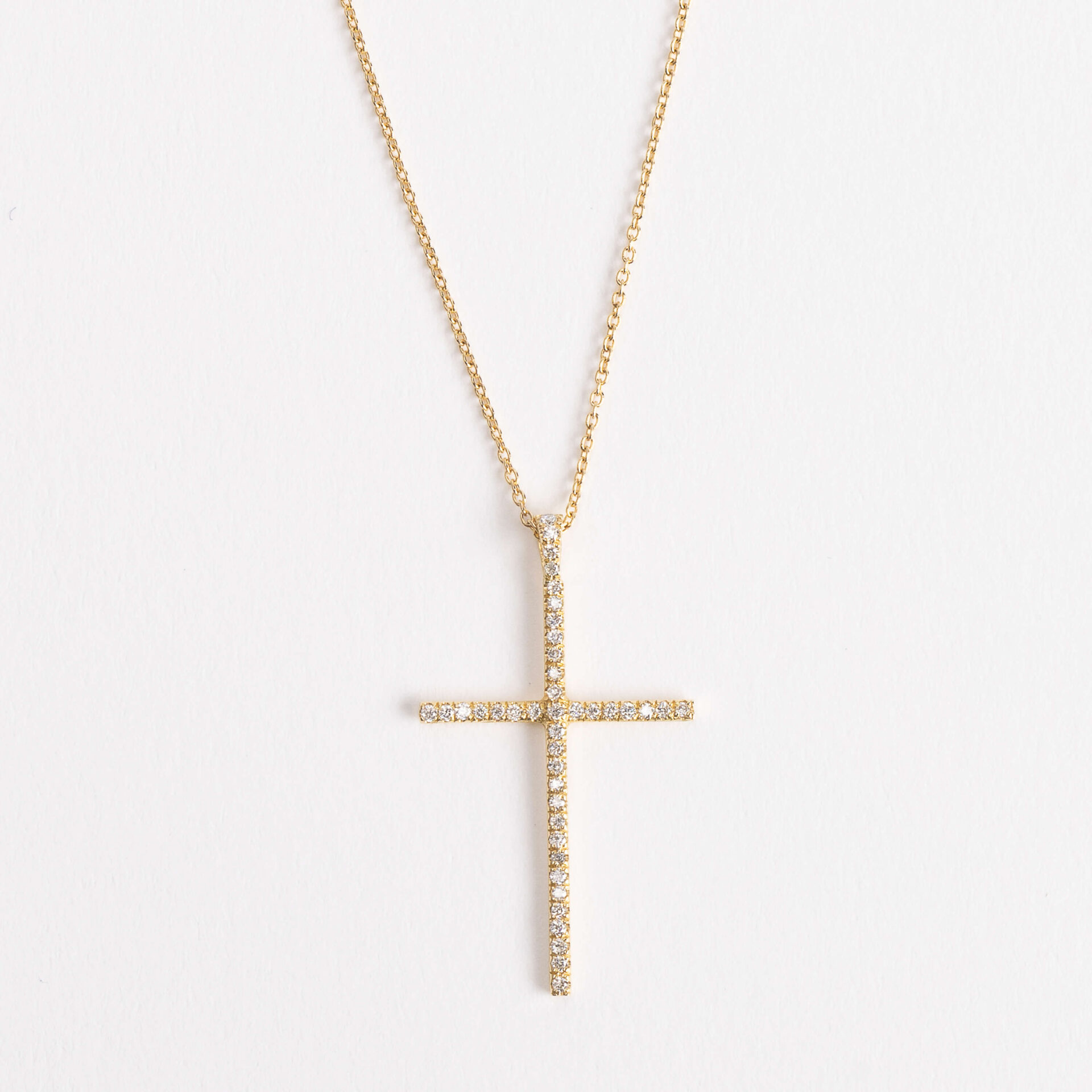 Details: Crafted in 18K yellow gold, Irene features 0.11ct of diamonds set along the full length of the cross and onto the hoop. Height: 2.5 cm. Width: 1.45 cm.