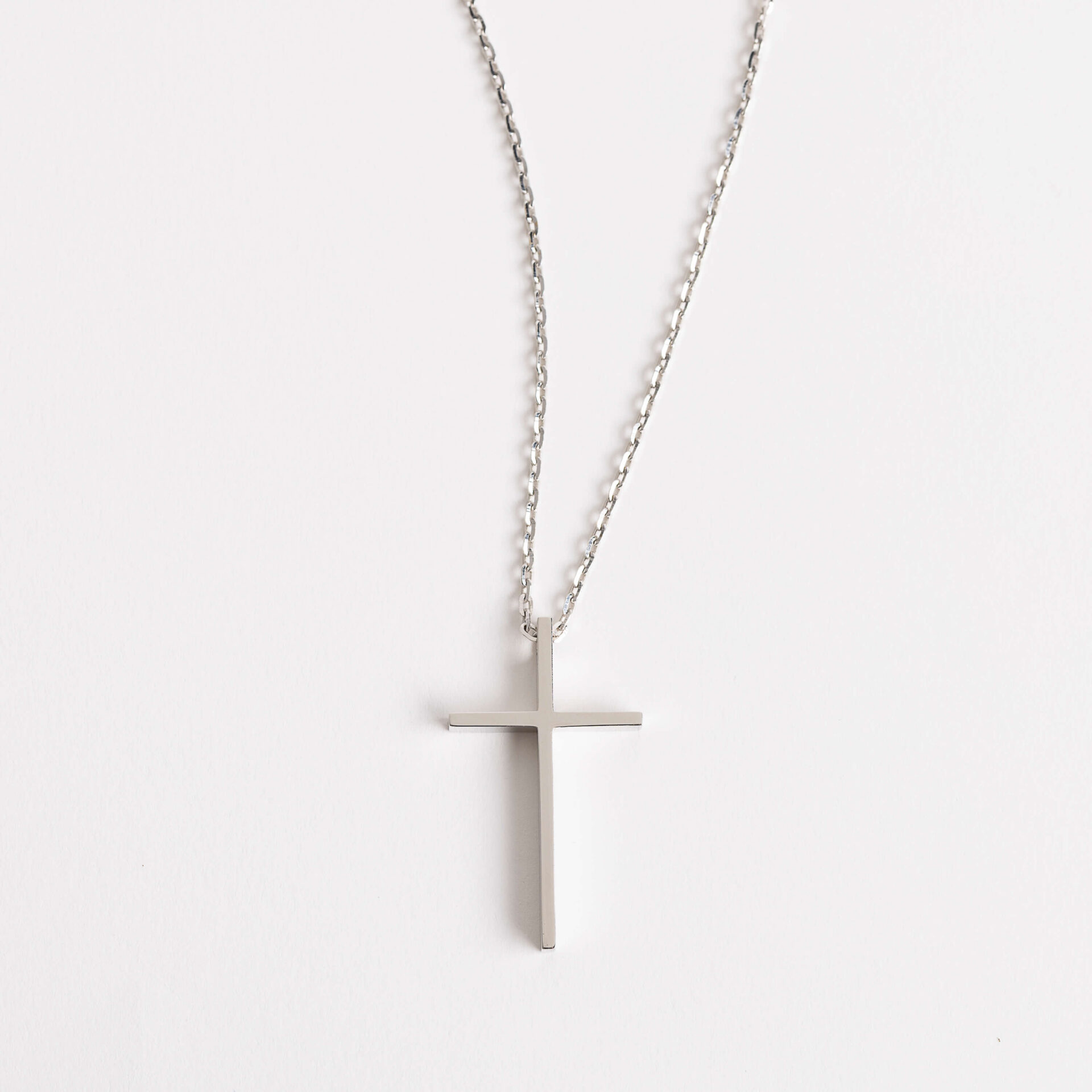 This cross is handcrafted in 18kt white gold and features a hidden internal hoop through which the chain runs seamlessly. It measures 3.9 cm in height, 2 cm in width, and 3.5 mm in depth, resulting in a modern silhouette suitable for both daily wear and special occasions. It is paired with a 14kt white gold chain, 44 cm in length, with alternative chain options available upon request for adult wear or for those who prefer an 18kt gold chain.