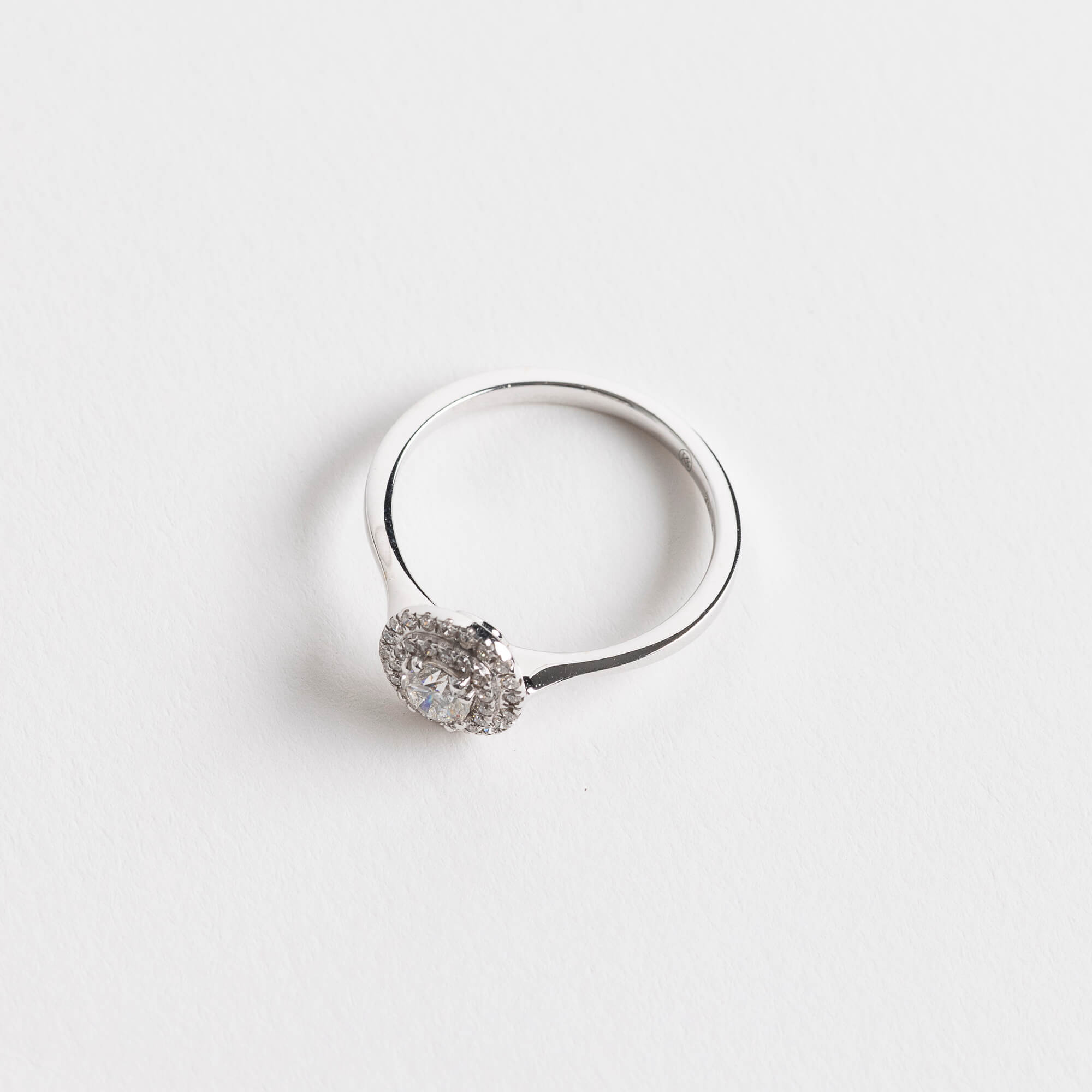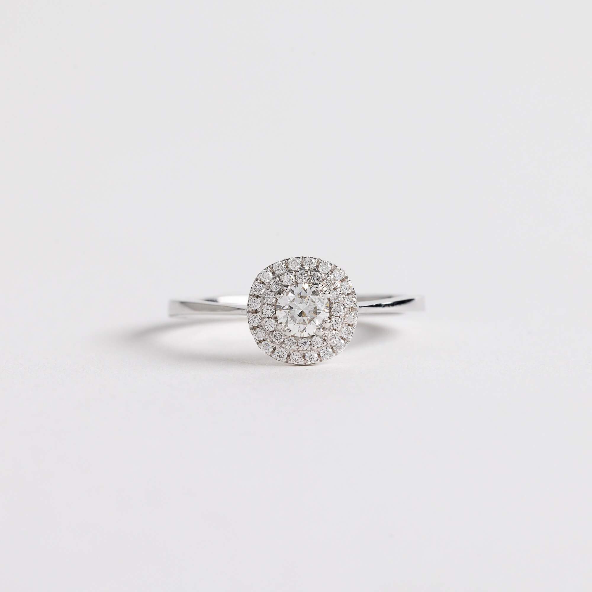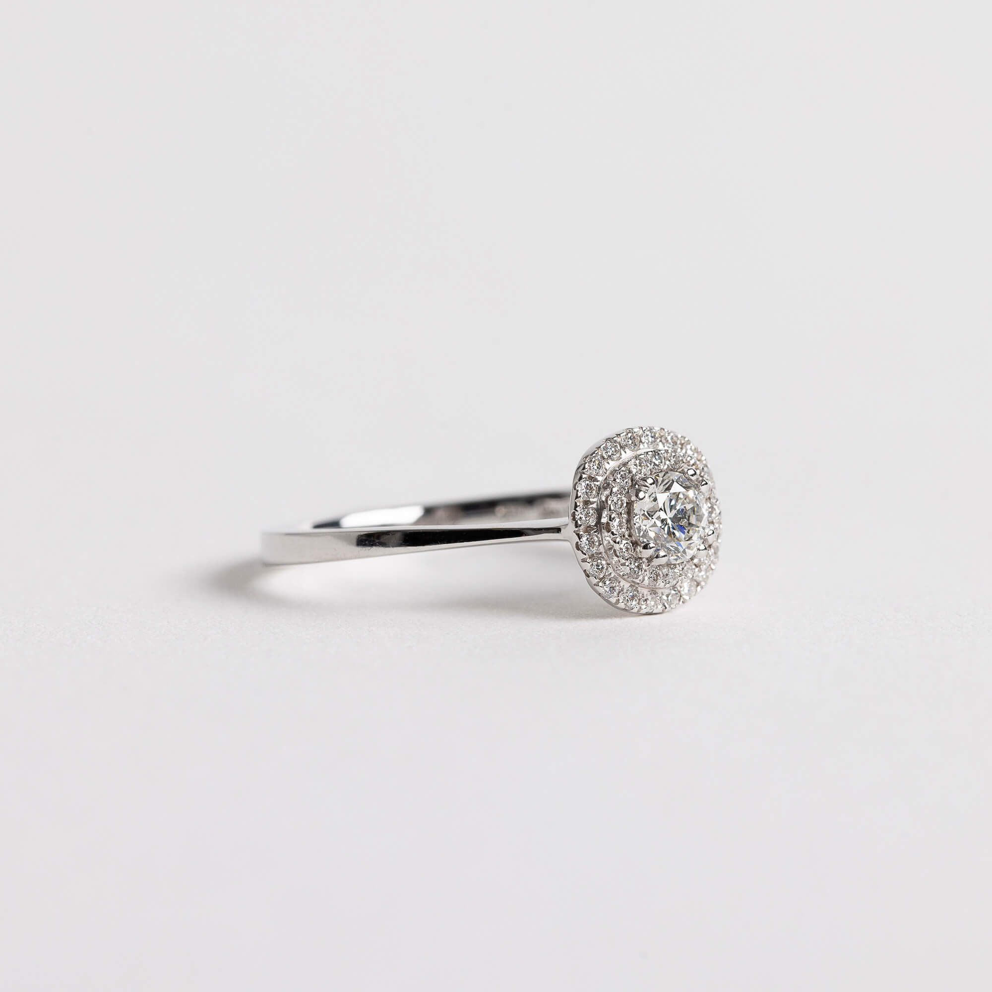 Details: Crafted in 18K white gold, the Marisa Ring features a 0.25ct round brilliant centre diamond, surrounded by 0.14ct of brilliant-cut diamonds in a double halo.