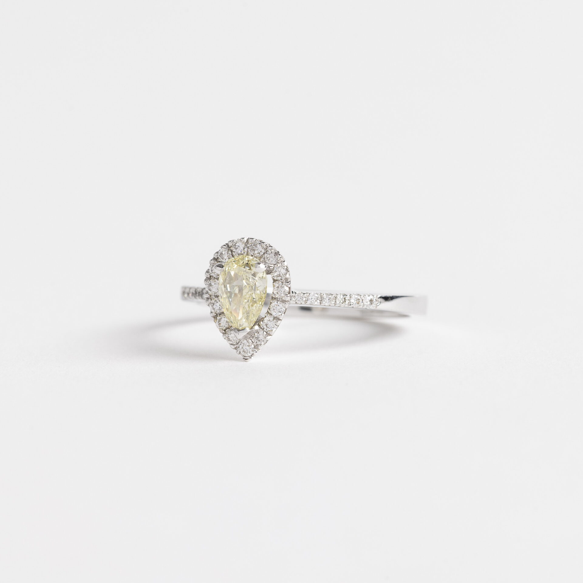 At the centre lies a 0.47ct light fancy yellow pear-shaped diamond, framed by a halo of white brilliant-cut diamonds that enhance its glow with delicate contrast. Additional diamonds continue along the band, reaching just shy of the halfway point to add a soft shimmer without overwhelming the design. Crafted in 18K white gold, the Serena Ring blends warmth and brilliance in a way that feels elegant, classic, and effortlessly feminine.