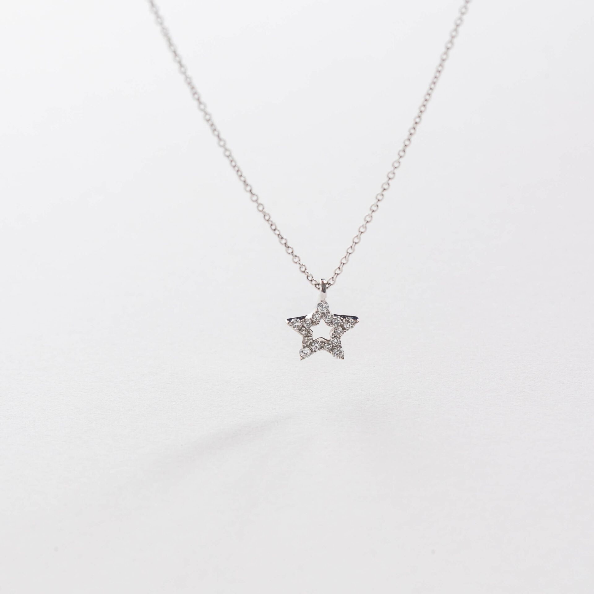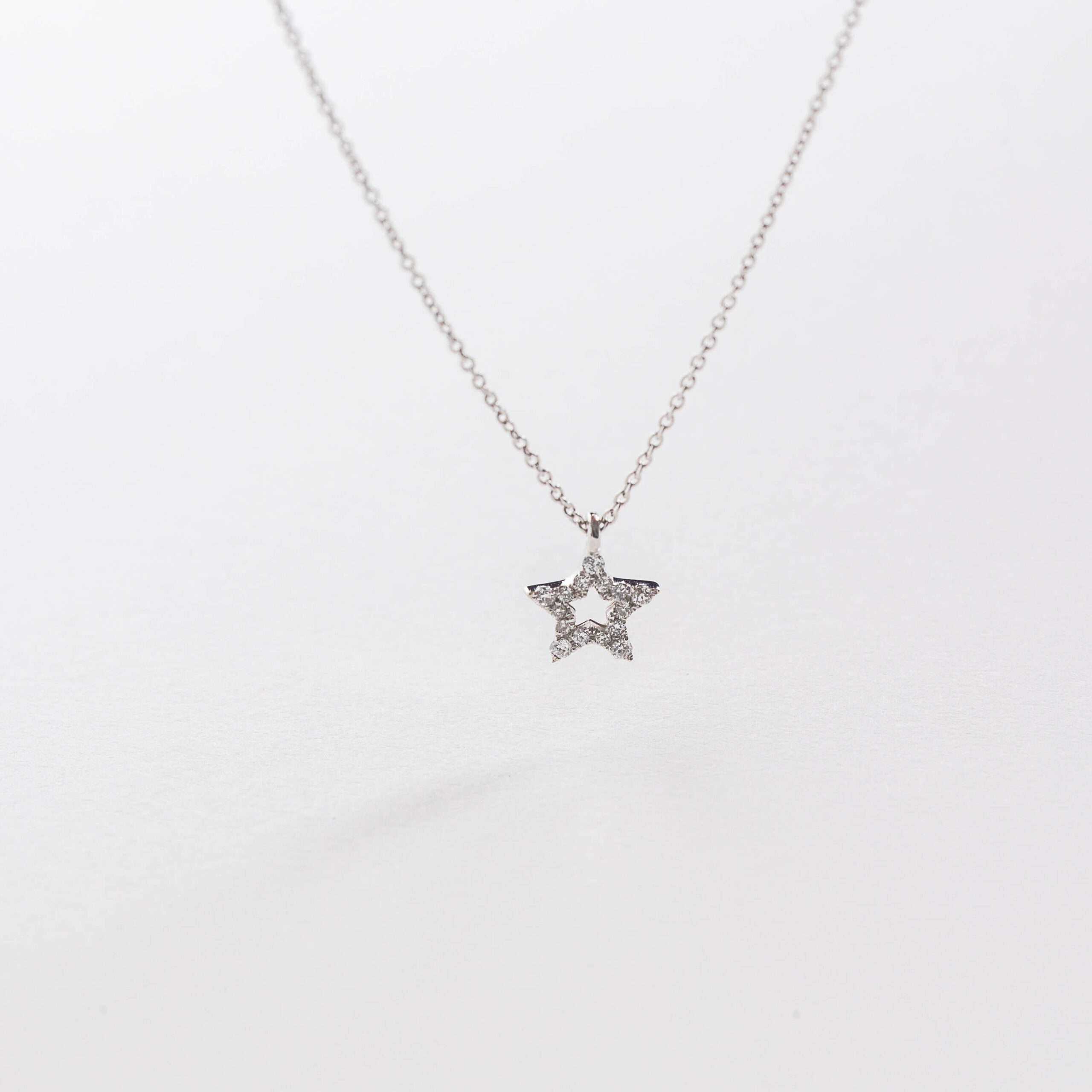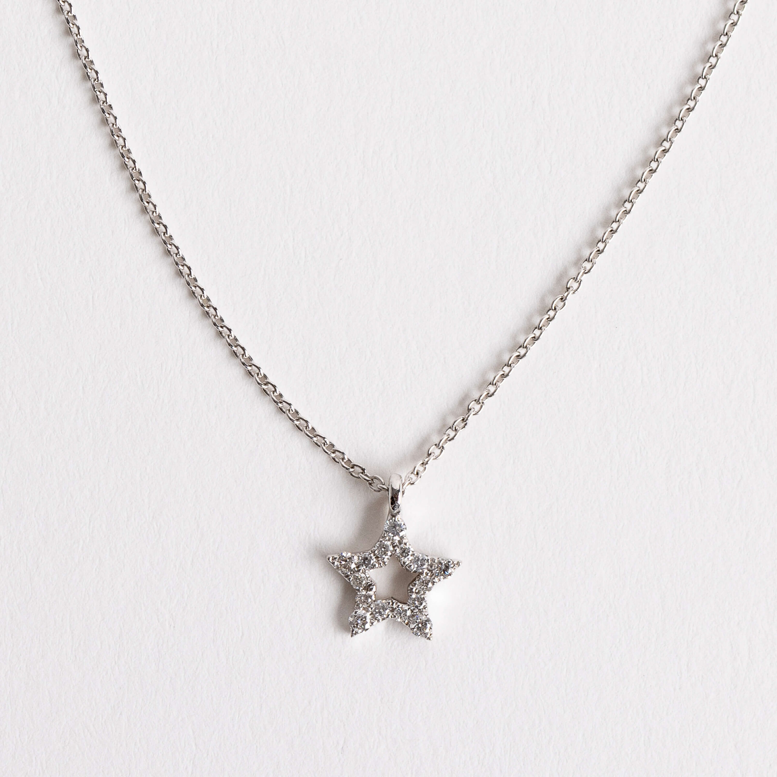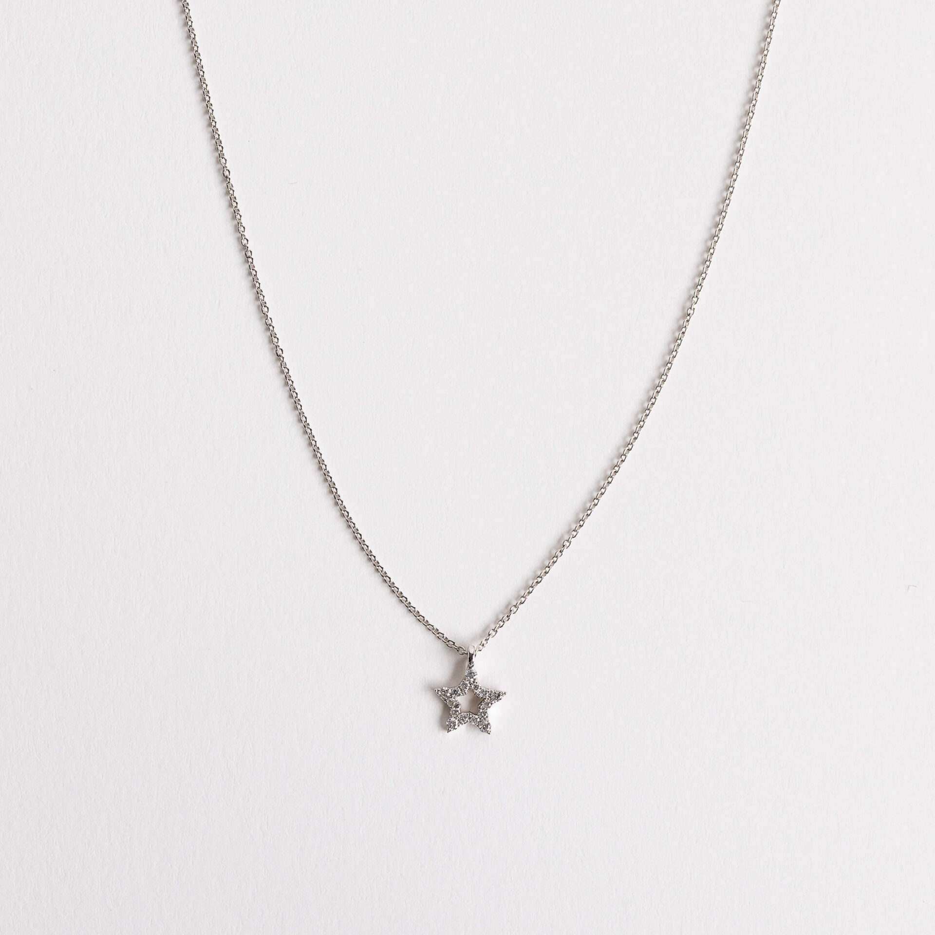 Details: Crafted in 18kt white gold, the Stella pendant measures 6.5 mm in height (without hoop) and features 0.07ct of natural white diamonds. The pendant is integrated into the chain and cannot be removed, ensuring a fluid and elegant fit. The 18kt white gold chain measures 42 cm, with an additional loop at 39 cm for a shorter, more delicate length.